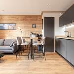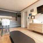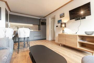Equipements : Séjour avec coin cuisine équipé (four combiné micro-ondes, réfrigérateur, lave-vaisselle, plaques induction, hotte aspirante), coin salon avec TV, connexion WIFI.